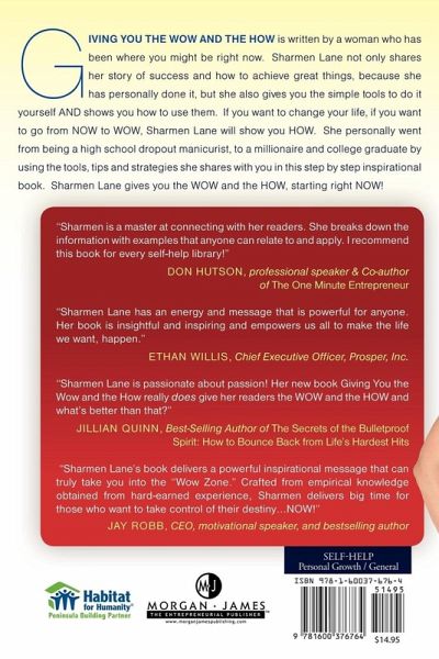 "Giving You the Wow and the How" is written by a woman who has been where you might be right now. Sharmen Lane not only shares her story of success and how to achieve great things, because she has personally done it, but she also gives you the simple tools to do it yourself AND shows you how to use them. If you want to change your life, if you want to go from NOW to WOW, Sharmen Lane will show you HOW. She personally went from being a high school dropout manicurist, to a millionaire and college graduate by using the tools, tips and strategies she shares with you in this step by step inspirational book. Sharmen Lane gives you the WOW and the HOW, starting right NOW!