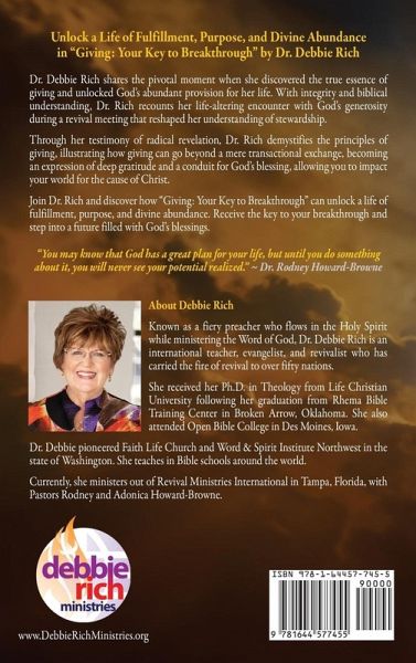 Unlock a Life of Fulfillment, Purpose, and Divine Abundance in "Giving: Your Key to Breakthrough" by Dr. Debbie Rich Dr. Debbie Rich shares the pivotal moment when she discovered the true essence of giving and unlocked God's abundant provision for her life. With integrity and biblical understanding, Dr. Rich recounts her life-altering encounter with God's generosity during a revival meeting that reshaped her understanding of stewardship. Through her testimony of radical revelation, Dr. Rich demystifies the principles of giving, illustrating how giving can go beyond a mere transactional exchange, becoming an expression of deep gratitude and a conduit for God's blessing, allowing you to impact your world for the cause of Christ. Join Dr. Rich and discover how "Giving: Your Key to Breakthrough" can unlock a life of fulfillment, purpose, and divine abundance. Receive the key to your breakthrough and step into a future filled with God's blessings. "You may know that God has a great plan for your life, but until you do something about it, you will never see your potential realized." ~Dr. Rodney Howard-Browne About Debbie Rich: Known as a fiery preacher who flows in the Holy Spirit while ministering the Word of God, Dr. Debbie Rich is an international teacher, evangelist, and revivalist who has carried the fire of revival to over fifty nations. She received her Ph.D. in Theology from Life Christian University following her graduation from Rhema Bible Training Center in Broken Arrow, Oklahoma. She also attended Open Bible College in Des Moines, Iowa. Dr. Debbie pioneered Faith Life Church and Word & Spirit Institute Northwest in the state of Washington. She teaches in Bible schools around the world. Currently, she ministers out of Revival Ministries International in Tampa, Florida, with Pastors Rodney and Adonica Howard-Browne.