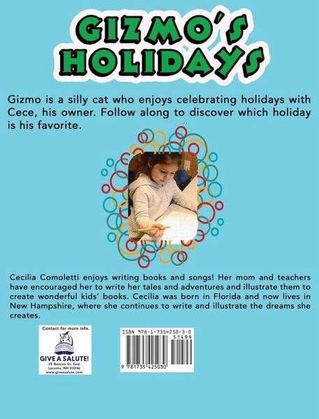Gizmo is a silly cat who enjoys celebrating holidays with Cece, his owner. Follow along to discover which holiday is his favorite. The author, Cecilia Comoletti, is seven-years-old. She enjoys writing books and songs! Her mom and teachers have encouraged her to write her tales and adventures and illustrate them to create wonderful kids' books. Cecilia was born in Florida, and now lives in New Hampshire, where she continues to write and illustrate the dreams she creates.