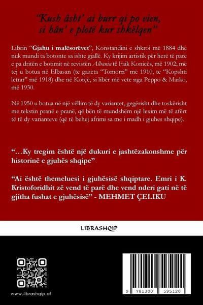 "Gjahu i malësorëvet: Hieja e Tomorrit" nga Konstandin Kristoforidhi Konstandin Kristoforidhi (1827-1895), një pionier i gjuhësisë dhe letërsisë shqiptare, shkroi një nga veprat e para që shfaq të dy dialektet kryesore të gjuhës shqipe-Gegërishten dhe Toskërishten-brenda një libri të vetëm. Ky tregim i shquar nuk është vetëm një perlë letrare, por edhe një moment historik gjuhësor, që ruan pasurinë e trashëgimisë së dyfishtë të shqipes. Me një sy të mprehtë për rrëfimin dhe një dashuri të thellë për gjuhën amtare, Kristoforidhi ndërthur një histori që tejkalon dallimet dialektore, duke dëshmuar se gjuha nuk ndan, por bashkon. Vepra e tij mbetet një dëshmi e Rilindjes Kombëtare Shqiptare dhe përpjekjeve për të zhvilluar një gjuhë të shkruar të unifikuar në shekullin e 19-të. Ky botim paraqet të dyja versionet e tregimit krah për krah, duke ofruar një përvojë unike leximi për gjuhëtarët, historianët dhe dashamirësit e letërsisë shqiptare. Pavarësisht nëse ju tërheq rëndësia historike, vlera letrare, apo thjesht rrëfimi magjepsës, "Gjahu i malësorëvet" është një shtesë e domosdoshme për çdo koleksion mbi letërsinë ballkanike dhe trashëgiminë gjuhësore.