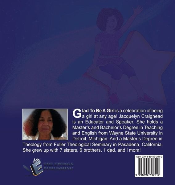 Glad To Be A Girl is a celebration of being a girl at any age! Jacquelyn Craighead is an Educator and Speaker. She holds a Master's and Bachelor's Degree in Teaching and English from Wayne State University in Detroit, Michigan. And a Master's Degree in Theology from Fuller Theological Seminary in Pasadena, California. She grew up with 7 sisters, 6 brothers, 1 dad, and l mom!