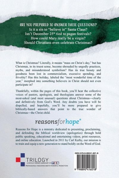 ARE YOU PREPARED TO ANSWER THESE QUESTIONS? Is it a sin to "believe in" Santa Claus? Isn't December 25th tied to pagan festivals? How could Mary really be a virgin? Should Christians even celebrate Christmas? What is Christmas? Literally, it means "mass on Christ's day," but has Christmas, in its truest sense, become shrouded by ungodly practices, myths, and misunderstood symbolism? Has its true beauty and goodness been lost in commercialism, excessive spending, and frivolity? Has this holiday, labeled the "most wonderful time of the year," morphed into something believers in Christ should not even participate in? Thankfully, within the pages of this book, you'll hear the collective voices of pastors, apologists, and theologians answer some of the most-asked (and most unusual) questions about Christmas - clearly and definitively from God's Word. Any doubts you have will be dispelled, and hopefully, you'll be more prepared to give biblically-based answers that point to the true wonder of Christmas - the Christ child.