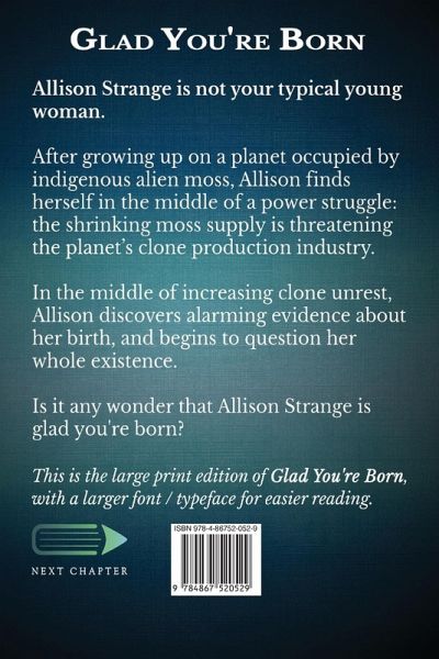 Allison Strange is not your typical young woman. After growing up on a planet occupied by indigenous alien moss, Allison finds herself in the middle of a power struggle: the shrinking moss supply is threatening the planet's clone production industry. In the middle of increasing clone unrest, Allison discovers alarming evidence about her birth, and begins to question her whole existence. Is it any wonder that Allison Strange is glad you're born? This is the large print edition of Glad You're Born, with a larger font / typeface for easier reading.