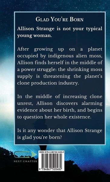 Allison Strange is not your typical young woman. After growing up on a planet occupied by indigenous alien moss, Allison finds herself in the middle of a power struggle: the shrinking moss supply is threatening the planet's clone production industry. In the middle of increasing clone unrest, Allison discovers alarming evidence about her birth, and begins to question her whole existence. Is it any wonder that Allison Strange is glad you're born?