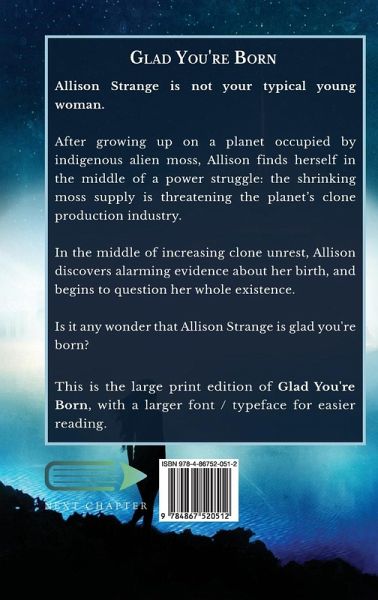 Allison Strange is not your typical young woman. After growing up on a planet occupied by indigenous alien moss, Allison finds herself in the middle of a power struggle: the shrinking moss supply is threatening the planet's clone production industry. In the middle of increasing clone unrest, Allison discovers alarming evidence about her birth, and begins to question her whole existence. Is it any wonder that Allison Strange is glad you're born? This is the large print edition of Glad You're Born, with a larger font / typeface for easier reading.