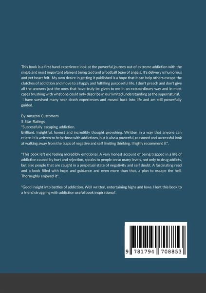 This book is a first hand experience look at the powerful journey out of extreme addiction with the single and most important element being God and a football team of angels. It's delivery is humorous and yet heart felt. My own desire in getting it published is a hope that it can help others escape the clutches of addiction and move to a happy and fulfilling purposeful life. I don't preach and don't give all the answers just the ones that have truly be given to me in an extraordinary way and in most cases brushing with what one could only describe in our limited understanding as the supernatural. I have survived many near death experiences and moved back into life and am still powerfully guided. The following reviews are By Amazon Customer's 5 Star Ratings "Successfully escaping addiction. Brilliant. Insightful, honest and incredibly thought provoking. Written in a way that anyone can relate. It is written to help those with addictions, but is also a powerful, reasoned and successful look at walking away from the traps of negative and self limiting thinking. I highly recommend it". "This book left me feeling incredibly emotional. A very honest account of being trapped in a life of addiction caused by hurt and rejection, speaks to people on so many levels, not only to drug addicts, but also people that are caught in a perpetual state of negativity and self doubt. A fascinating read and a book filled with hope and guidance and even more than that, a plan to escape the hell. Thoroughly enjoyed it". "Good insight into battles of addiction. Well written, entertaining highs and lows. I lent this book to a friend struggling with addiction useful book inspirational'.