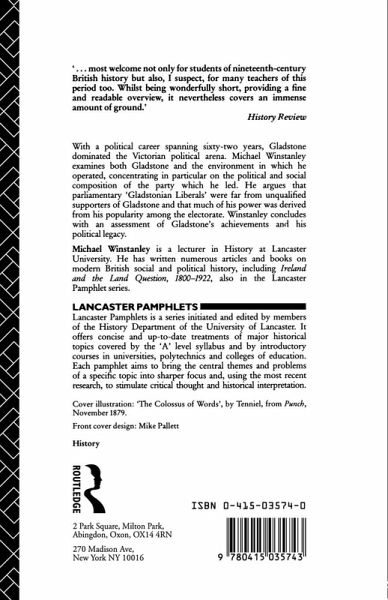 With a public career spanning 62 years, Gladstone dominated the Victorian political arena. Yet he remains an enigmatic figure; a high Anglican, Tory protectionist who became leader of the Liberals, a party associated with free trade and religious Nonconformity. Michael Winstanley examines both Gladstone and the environment in which he operated, concentrating in particular on the political and social composition of the party which he led. He argues that the parliamentary `Gladstonian Liberals' were far from unqualified supporters of Gladstone and that much of his power was derived from his popularity amongst the electorate. He concludes with an assessment of Gladstone's achievements and his political legacy.