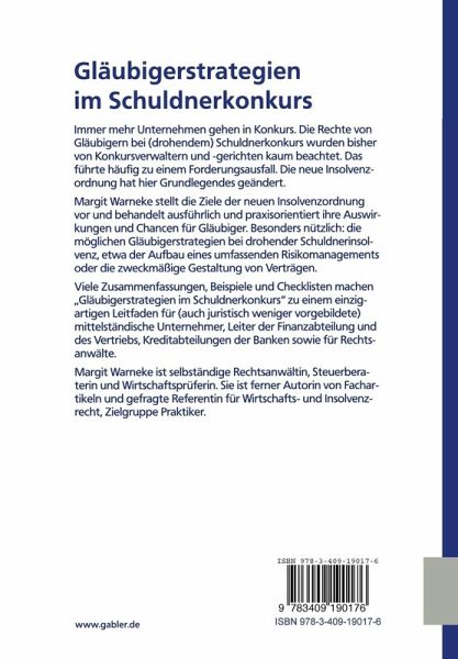 Margit Warneke ist selbständige Rechtsanwältin, Steuerberaterin und Wirtschaftsprüferin. Sie ist ferner Expertin, Autorin von Fachartikeln und erfolgreiche Referentin für Wirtschafts- und Insolvenzrecht.