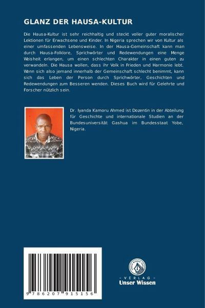 Die Hausa-Kultur ist sehr reichhaltig und steckt voller guter moralischer Lektionen für Erwachsene und Kinder. In Nigeria sprechen wir von Kultur als einer umfassenden Lebensweise. In der Hausa-Gemeinschaft kann man durch Hausa-Folklore, Sprichwörter und Redewendungen eine Menge Weisheit erlangen, um einen schlechten Charakter in einen guten zu verwandeln. Die Hausa wollen, dass ihr Volk in Frieden und Harmonie lebt. Wenn sich also jemand innerhalb der Gemeinschaft schlecht benimmt, kann sich das Leben der Person durch Sprichwörter, Geschichten und Redewendungen zum Besseren wenden. Dieses Buch wird für Gelehrte und Forscher nützlich sein.