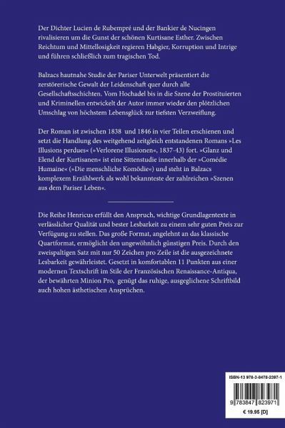 Honoré de Balzac: Glanz und Elend der Kurtisanen. Roman Großformat, 210 x 297 mm, zweispaltiger Satz Berliner Ausgabe, 2019 Durchgesehener Neusatz bearbeitet und eingerichtet von Theodor Borken Die Reihe Henricus erfüllt den Anspruch, wichtige Grundlagentexte in verlässlicher Qualität und bester Lesbarkeit zu einem sehr guten Preis zur Verfügung zu stellen. Das große Format, angelehnt an das klassische Quartformat, ermöglicht den ungewöhnlich günstigen Preis. Durch den zweispaltigen Satz mit nur 50 Zeichen pro Zeile ist die ausgezeichnete Lesbarkeit gewährleistet. Gesetzt in komfortablen 11 Punkten aus einer modernen Textschrift im Stile der Französischen Renaissance-Antiqua, der bewährten Minion Pro, genügt das ruhige, ausgeglichene Schriftbild auch hohen ästhetischen Ansprüchen. Erstdruck des 1. Teils, »La Torpille«, zusammen mit »La femme supérieure« und »La maison Nucingen«, Paris 1838. 2. Teil, »Esther ou Les Amours d'un vieux banquier« in : Le Parisien, Mai/Juli 1843 (unvollständig). 3. Teil, »Une instruction criminelle«, in : L'Époque, 7.¿29.7. 1846. 4. Teil in: L'Époque, 1847. Hier nach der Übers. v. Felix Paul Greve, Leipzig: Insel-Verlag, 1909. Neuausgabe. Großformat, 210 x 297 mm, zweispaltiger Satz Herausgegeben von Theodor Borken. Berlin 2019. Textgrundlage sind die Ausgaben: Balzac, Honoré de: Glanz und Elend der Kurtisanen. 2 Bände, übers. v. Felix Paul Greve, Leipzig: Insel-Verlag, 1909. Umschlaggestaltung von Thomas Schultz-Overhage unter Verwendung des Bildes: Theo van Rysselberghe, Frau im Spiegel, 1907. Gesetzt aus der Minion Pro, 11 pt.