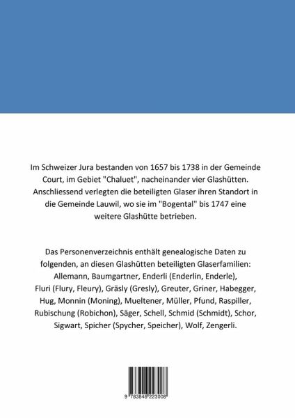Im Schweizer Jura bestanden von 1657 bis 1738 in der Gemeinde Court, im Gebiet "Chaluet", nacheinander vier Glashütten. Anschliessend verlegten die beteiligten Glaser ihren Standort in die Gemeinde Lauwil, wo sie im "Bogental" bis 1747 eine weitere Glashütte betrieben.Das Personenverzeichnis enthält genealogische Daten zu folgenden, an diesen Glashütten beteiligten Glaserfamilien:Allemann, Baumgartner, Enderli (Enderlin, Enderle), Fluri (Flury, Fleury), Gräsly (Gresly), Greuter, Griner, Habegger, Hug, Monnin (Moning), Mueltener, Müller, Pfund, Raspiller, Rubischung (Robichon), Säger, Schell, Schmid (Schmidt), Schor, Sigwart, Spicher (Spycher, Speicher), Wolf, Zengerli.