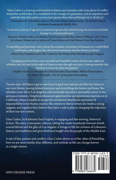 Twenty-year-old Maya is given one hour to pack one suitcase and flee her home in war-torn Beirut, leaving behind everyone and everything she knows and loves. She rebuilds a new life in Los Angeles, and eventually launches a successful career in the aerospace industry. Despite professional opportunities and glamorous experiences in California, Maya is unable to escape her emotional attachment and sense of responsibility to her home country. She returns to Beirut where she meets a young surgeon, and together they believe they have a role to play in changing the trajectory of their war-torn nation. Glass Cedars, by Katherine Saad Feghali, is engaging and fast-moving, historical fiction. The story crisscrosses cultures, taking the reader seamlessly between bomb scarred Beirut and the glitz of Los Angeles. It brings to life the richness of Lebanon's history and traditions and gives firsthand insight into the people of the Middle East. A tale of fate, passion and conflict, Glass Cedars shows us of the value of friendship, how we are more similar than different, and reminds us life can change forever in a single instant.
