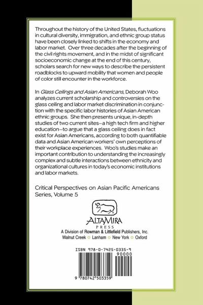 Throughout the history of the United States, fluctuations in cultural diversity, immigration, and ethnic group status have been closely linked to shifts in the economy and labor market. Over three decades after the beginning of the civil rights movement, and in the midst of significant socioeconomic change at the end of this century, scholars search for new ways to describe the persistent roadblocks to upward mobility that women and people of color still encounter in the workforce. In Glass Ceilings and Asian Americans, Deborah Woo analyzes current scholarship and controversies on the glass ceiling and labor market discrimination in conjunction with the specific labor histories of Asian American ethnic groups. She then presents unique, in-depth studies of two current sites-a high tech firm and higher education-to argue that a glass ceiling does in fact exist for Asian Americans, both according to quantifiable data and to Asian American workers' own perceptions of their workplace experiences. Woo's studies make an important contribution to understanding the increasingly complex and subtle interactions between ethnicity and organizational cultures in today's economic institutions and labor markets.