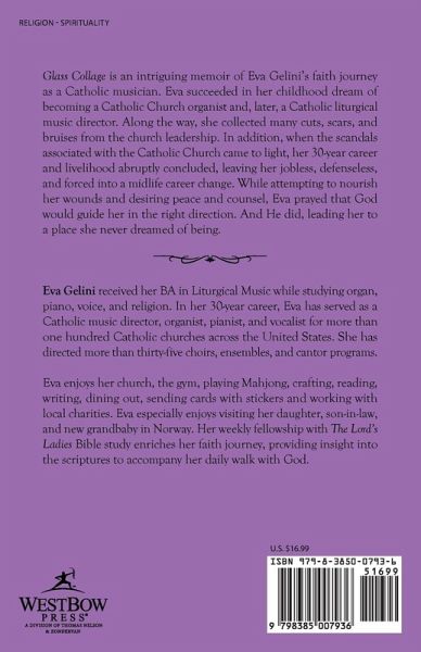 Glass Collage is an intriguing memoir of Eva Gelini's faith journey as a Catholic musician. Eva succeeded in her childhood dream of becoming a Catholic Church organist and, later, a Catholic liturgical music director. Along the way, she collected many cuts, scars, and bruises from the church leadership. In addition, when the scandals associated with the Catholic Church came to light, her 30-year career and livelihood abruptly concluded, leaving her jobless, defenseless, and forced into a midlife career change. While attempting to nourish her wounds and desiring peace and counsel, Eva prayed that God would guide her in the right direction. And He did, leading her to a place she never dreamed of being.