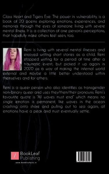 Remi is living with several mental illnesses and enjoyed writing short stories as a child. Remi stopped writing for a period of time after a traumatic event; but picked it up again in 2020 as a way of making the internal world external and maybe a little better understood within themselves and for others. Remi is a queer person who also identifies as transgender non-binary queer and uses they/them/their pronouns. Remi's favourite quote is "All waves must end" which means no single emotion is permanent, like waves in the ocean crashing onto shore and pulling out to sea again, all emotions have a peak and must eventually settle.