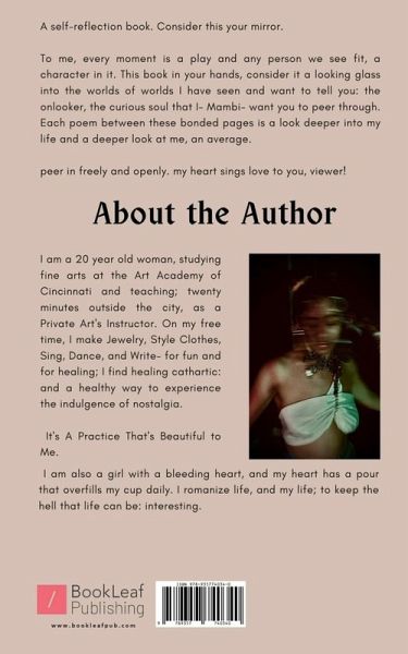 ""A self-reflection book. Consider this your mirror. To me, every moment is a play and any person we see fit, a character in it. This book in your hands, consider it a looking glass into the worlds of worlds I have seen and want to tell you: the onlooker, the curious soul that I- Mambi- want you to peer through. Each poem between these bonded pages is a look deeper into my life and a deeper look at me, an average. peer in freely and openly. my heart sings love to you, viewer!""