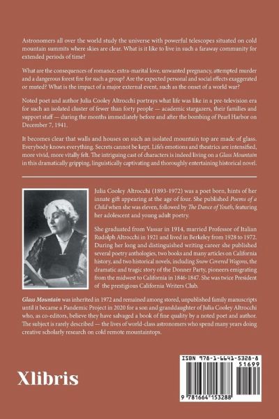 Astronomers all over the world study the universe with powerful telescopes situated on cold mountain summits where skies are clear. What is it like to live in such a faraway community for extended periods of time? What are the consequences of romance, extra-marital love, unwanted pregnancy, attempted murder and a dangerous forest fire for such a group? Are the expected personal and social effects exaggerated or muted? What is the impact of a major external event, such as the onset of a world war? Noted poet and author Julia Cooley Altrocchi portrays what life was like in a pre-television era for such an isolated cluster of fewer than forty people - academic stargazers, their families and support staff - during the months immediately before and after the bombing of Pearl Harbor on December 7, 1941. It becomes clear that walls and houses on such an isolated mountain top are made of glass. Everybody knows everything. Secrets cannot be kept. Life's emotions and theatrics are intensified, more vivid, more vitally felt. The intriguing cast of characters is indeed living on a Glass Mountain in this dramatically gripping, linguistically captivating and thoroughly entertaining historical novel.