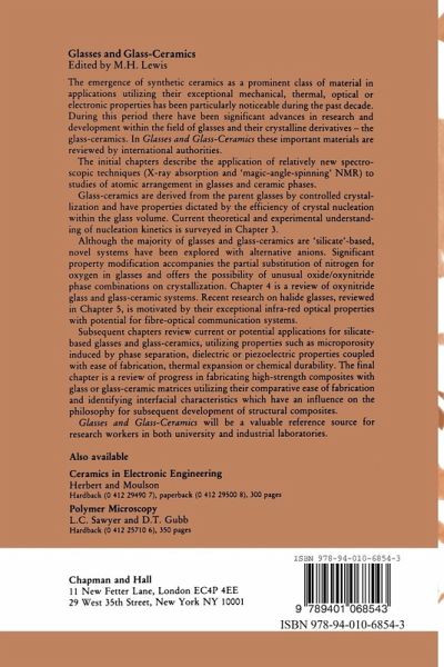 The emergence of synthetic ceramics as a prominent class of materials with a unique combination of properties has been an important part of the materials-science scene over the past 20 years. These 'high-technology' ceramics have varied applications in areas utilizing their exceptional mechanical, thermal, optical, magnetic or electronic properties. A notable development of the 1970s was that of 'Si-based' ceramics (Si3N4' SiC and 'Sialons') as high-temperature engineering solids. More recently the zirconia-based ceramics have evolved as a class of material with significant improvements in fracture-toughness. In the 1980s we are on the threshold of development of ceramic-matrix composites with the promise of over coming major limitations in engineering design with 'brittle' ceramics and the development of novel properties unattainable with monolithic micro structures. Throughout this period there have been significant but less well-publicized developments in the field of glass-ceramics and glasses. It is the purpose of this publication to review selected topics within this important area of materials science. A key element in understanding the relation between properties and microstructure is a knowledge of atomic arrangement in ceramic phases. Recent developments in NMR and X-ray absorption spectroscopies have had considerable impact on studies of atomic co-ordination in glasses and crystalline ceramic materials and are reviewed in Chapters 1 and 2. Glass-ceramics are derived from the parent glasses by controlled crystal lization and have properties dictated, in part, by the efficiency of crystal nucleation within the glass volume.