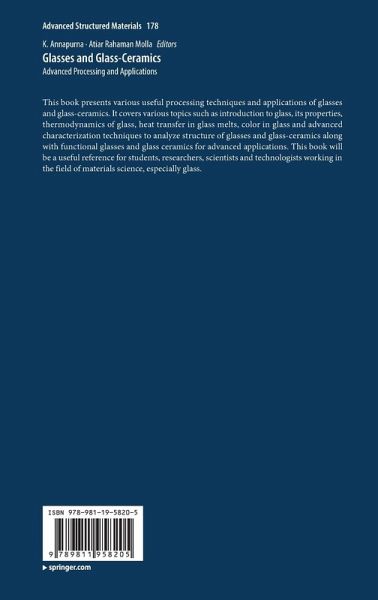 This book presents various useful processing techniques and applications of glasses and glass-ceramics. It covers various topics such as introduction to glass, its properties, thermodynamics of glass, heat transfer in glass melts, color in glass and advanced characterization techniques to analyze structure of glasses and glass-ceramics along with functional glasses and glass ceramics for advanced applications. This book will be a useful reference for students, researchers, scientists and technologists working in the field of materials science, especially glass.