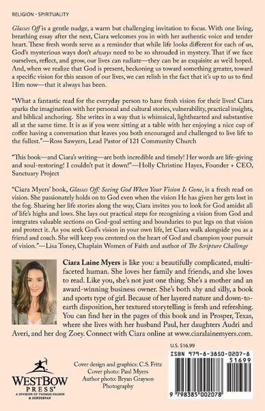 Glasses Off is a gentle nudge, a warm but challenging invitation to focus. With one living, breathing essay after the next, Ciara welcomes you in with her authentic voice and tender heart. These fresh words serve as a reminder that while life looks different for each of us, God's mysterious ways don't always need to be so shrouded in mystery. That if we face ourselves, reflect, and grow, our lives can radiate-they can be as exquisite as we'd hoped. And, when we realize that God is present, beckoning us toward something greater, toward a specific vision for this season of our lives, we can relish in the fact that it's up to us to find Him now-that it always has been. "What a fantastic read for the everyday person to have fresh vision for their lives! Ciara sparks the imagination with her personal and cultural stories, vulnerability, practical insights, and biblical anchoring. She writes in a way that is whimsical, lighthearted and substantive all at the same time. It is as if you were sitting at a table with her enjoying a nice cup of coffee having a conversation that leaves you both encouraged and challenged to live life to the fullest."-Ross Sawyers, Lead Pastor of 121 Community Church "This book-and Ciara's writing-are both incredible and timely! Her words are life-giving and soul-restoring! I couldn't put it down!"-Holly Christine Hayes, Founder + CEO, Sanctuary Project "Ciara Myers' book, Glasses Off: Seeing God When Your Vision Is Gone, is a fresh read on vision. She passionately holds on to God even when the vision He has given her gets lost in the fog. Sharing her life stories along the way, Ciara invites you to look for God amidst all of life's highs and lows. She lays out practical steps for recognizing a vision from God and integrates valuable sections on God-goal setting and boundaries to put legs on that vision and protect it. As you seek God's vision in your own life, let Ciara walk alongside you as a friend and coach. She will keep you centered on the heart of God and champion your pursuit of vision."-Lisa Toney, Chaplain Women of Faith and author of The Scripture Challenge