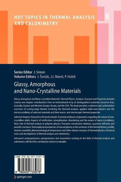 1. Introduction: Some Essential Attributes of Glassiness Regarding the Nature of Non-Crystalline Solids (Hiroshi Suga).- 2. Heat Capacity and Entropy Functions in Strong and Fragile Glass-Formers, Relative to those of Disordering Crystalline Materials (C. Austen Angell).- 3. Vibration Forms in the Vicinity of Glass Transition, Structural Changes and the Creation of Voids when Assuming the Role of Polarizability (Jaroslav Sesták, Borivoj Hlavácek, Pavel Hubík, Jirí J. Mares).- 4. Some Aspects of Vitrification, Amorphisation and Disordering and the Generated Extent of Nano-Crystallinity (Jaroslav Sesták, Carlos A. Queiroz, Jirí J. Mares, Miroslav Holecek).- 5. Basic Role of Thermal Analysis in Polymer Physics (Adam L. Danch).- 6. Phases of Amorphous, Crystalline, and Intermediate Order in Microphase and Nanophase Systems (Bernhard Wunderlich).- 7. Thermal Portrayal of Phase Separation in Polymers Producing Nanophase Separated Materials (Ivan Krakovský, Yuko Ikeda).- 8. Solid Forms of Pharmaceutical Molecules (Bohumil Kratochvíl).- 9. Chalcogenide Glasses Selected as a Model System for Studying Thermal Properties (Zdenek Cernosek, Eva Cernosková, Jana Holubová).- 10. Viscosity Measurements Applied to Chalcogenide Glass-Forming Systems (Petr Kostál, Jana Shánelová, Jirí Málek).- 11. Thermal Properties and Related Structural Study of Oxide Glasses (Marek Liska, Mária Chromcíková).- 12. Oxide Glass Structure, Non-Bridging Oxygen and Feasible Magnetic Properties due to the Addition of Fe/Mn Oxides (Jaroslav Sesták, Marek Liska, Pavel Hubík).- 13. New Approach to Viscosity of Glasses (Isak Avramov).- 14. Transport Constitutive Relations, Quantum Diffusion and Periodic Reactions (Jirí J. Mares, Jaroslav Sesták, Pavel Hubík).- 15. In-Situ Investigation of the Fast Lattice Recovery during Electropulse Treatment of Heavily Cold Drawn Nanocrystalline Ni-Ti Wires (Petr Sittner, Jan Pilch, B. Malard, Remi Delville, Caroline Curfs).-16. Emanation Thermal Analysis as a Method for Diffusion Structural Diagnostics of Zircon and Brannerite Minerals (Vladimír Balek, Iraida M. Bountseva, Igor von Beckman).- 17. Scanning Transitiometry and its Application in Petroleum Industry and in Polymer and Food Science (Jean-Pierre E. Grolier).- 18. Constrained States Occurring in Plants Cryo-Processing and the Role of Biological Glasses (Jirí Zámecník, Jaroslav Sesták).- 19. Thermophysical Properties of Natural Glasses at the Extremes of the Thermal History Profile (Paul Thomas, Jaroslav Sesták, Klaus Heide, Ekkehard Füglein, Peter Simon).- 20. Hotness Manifold, Phenomenological Temperature and Other Related Concepts of Thermal Physics (Jirí J. Mares).- 21. Historical Roots and Development of Thermal Analysis and Calorimetry (Jaroslav Sesták, Pavel Hubík, Jirí J. Mares).