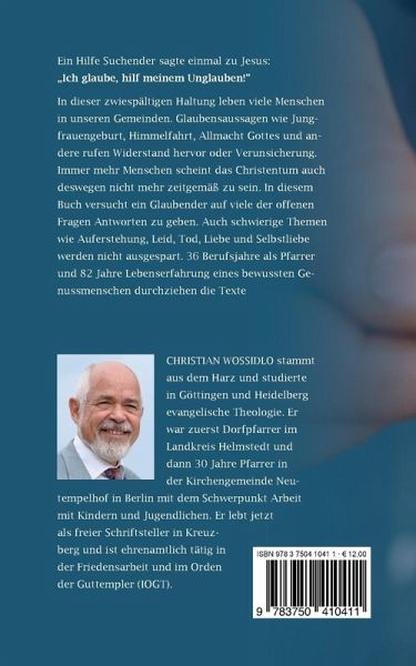 Ein Hilfesuchender sagte einmal zu Jesus: Ich glaube, hilf meinem Unglauben! Unter dieser zweiespältigen Geisteshaltung leiden viele Menschen in den Gemeinden. Viele Glaubensaussagen wie die Jungfrauengeburt, die Dreieinigkeit, die Himmelfahrt fordern Widerspruch heraus. Es gibt so viele Fragen. In diesem Buch versucht ein Glaubender im Rückblick auf ein langes Gleaubensleben Antworten zu geben. Auch schierige Themen wie Leid, Tod, Auferstehung, Liebe und Sex. Erbsünde, Gewaltlosigkeit werden nicht ausgespart. 36 Berufsjahre als Pfarrer und 82 Jahre Lebenserfahrung als bewußter Genußmensch durchziehen die Texte.
