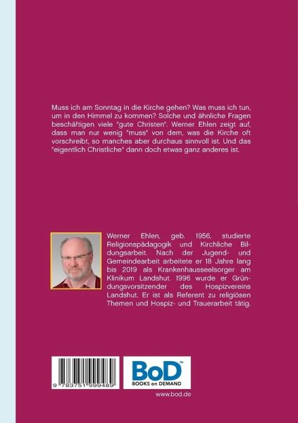 Muss ich am Sonntag in die Kirche gehen? Was muss ich tun, um in den Himmel zu kommen? Solche und ähnliche Fragen beschäftigen viele "gute Christen". Werner Ehlen zeigt auf, dass man nur wenig "muss" von dem, was die Kirche oft vorschreibt, so manches aber durchaus sinnvoll ist. Und das "eigentlich Christliche" dann doch etwas ganz anderes ist.