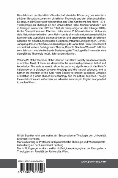 Das Jahrbuch der Karl-Heim-Gesellschaft dient der Förderung des interdisziplinären Gesprächs zwischen christlicher Theologie und den Wissenschaften. Es setzt, in der Gegenwart verantwortet, das Erbe Karl Heims fort. Heim (1874-1958) prägte als Theologe an den Universitäten Halle, Münster und seit 1920 in Tübingen sowie von 1920 bis 1948 als Frühprediger an der Tübinger Stiftskirche Generationen von Pfarrern. Unter seinen Zuhörern befanden sich auch viele Naturwissenschaftler, denn Heim konnte einerseits naturwissenschaftliche Sachverhalte zutreffend elementarisieren und andererseits den christlichen Glauben mit diesen Ergebnissen in einen fruchtbaren Dialog bringen. Der 28. Jahrgang dokumentiert die Jubiläumstagung 40 Jahre Karl-Heim-Gesellschaft und enthält weitere Beiträge zum Thema «Braucht Glauben Wissen?». Mit diesem Jahrbuch wird die bleibende Bedeutung der Theologie Karl Heims für eine dialogfähige Theologie im 21. Jahrhundert deutlich.