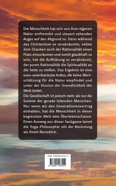 Die Menschheit hat sich von ihrer eigenen Natur entfremdet und steuert sehenden Auges auf den Abgrund zu. Denn während das Christentum es verabsäumte, neben dem Glauben auch der Rationalität einen Platz einzuräumen und somit glaubhaft zu sein, hat die Aufklärung es verabsäumt, der puren Rationalität die Spiritualität an die Seite zu stellen. Das Ergebnis ist eine euro-amerikanische Kultur, die keine Wertschätzung für die Natur empfindet und unter der Illusion der Unendlichkeit der Welt leidet.Die Gesellschaft ist jedoch mehr als nur die Summe der gerade lebenden Menschen. Nur wenn wir den Generationenvertrag einhalten, hat die Menschheit in dieser begrenzten Welt eine Überlebenschance. Einen Ausweg aus dieser Sackgasse kennt die Yoga-Philosophie mit der Besinnung als ihrem Kernstück.