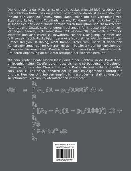 Die Ambivalenz der Religion ist eine alte Jacke, wiewohl bloß Ausdruck der menschlichen Natur. Des ungeachtet oder gerade darob ist es unabdingbar, ihr auf den Zahn zu fühlen, zumal dann, wenn mit der Verbindung von Staat und Religion, mit Totalitarismus und Fundamentalismus Unheil dräut. Je mehr sich der kleine Moritz nämlich durch Korruption und Misswirtschaft, Autorität und Gewalt sozial ungerecht behandelt fühlt, desto größer ist sein Verlangen danach, sich wenigstens mit seinem Glauben noch ein Stück Identität und also Würde zu bewahren. Mit der Dialogfähigkeit steht und fällt zugleich auch die Religion, denn eins ist so sicher wie das Amen in der Kirche: Religion ist Dialog, nicht Kampf. Mittel zum Zweck ist dabei der Konstruktivismus, der im Unterschied zum Patchwork der Religionskomponisten die herkömmlichen Konfessionen nicht verwässert. Vielmehr ist er um deren Anpassung an die Anforderungen der Moderne bemüht. Mit dem Räuber-Beute-Modell lässt Band 2 der Einblicke in die Borderlinephilosophie keinen Zweifel daran, dass sich eine so bedeutsame Glaubensgemeinschaft wie das Christentum ohne Dialogfähigkeit nicht bloß selbst zack, zack zu Fall bringt, sondern der Religion im Allgemeinen Abtrag tut und das Heer der Ungläubigen empfindlich vergrößert, anstatt es drastisch zu schmälern, kurzum Kollateralschäden verursacht.