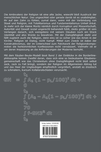 Die Ambivalenz der Religion ist eine alte Jacke, wiewohl bloß Ausdruck der menschlichen Natur. Des ungeachtet oder gerade darob ist es unabdingbar, ihr auf den Zahn zu fühlen, zumal dann, wenn mit der Verbindung von Staat und Religion, mit Totalitarismus und Fundamentalismus Unheil dräut. Je mehr sich der kleine Moritz nämlich durch Korruption und Misswirtschaft, Autorität und Gewalt sozial ungerecht behandelt fühlt, desto größer ist sein Verlangen danach, sich wenigstens mit seinem Glauben noch ein Stück Identität und also Würde zu bewahren. Mit der Dialogfähigkeit steht und fällt zugleich auch die Religion, denn eins ist so sicher wie das Amen in der Kirche: Religion ist Dialog, nicht Kampf. Mittel zum Zweck ist dabei der Konstruktivismus, der im Unterschied zum Patchwork der Religionskomponisten die herkömmlichen Konfessionen nicht verwässert. Vielmehr ist er um deren Anpassung an die Anforderungen der Moderne bemüht. Mit dem Räuber-Beute-Modell lässt Band 2 der Einblicke in die Borderlinephilosophie keinen Zweifel daran, dass sich eine so bedeutsame Glaubensgemeinschaft wie das Christentum ohne Dialogfähigkeit nicht bloß selbst zack, zack zu Fall bringt, sondern der Religion im Allgemeinen Abtrag tut und das Heer der Ungläubigen empfindlich vergrößert, anstatt es drastisch zu schmälern, kurzum Kollateralschäden verursacht.