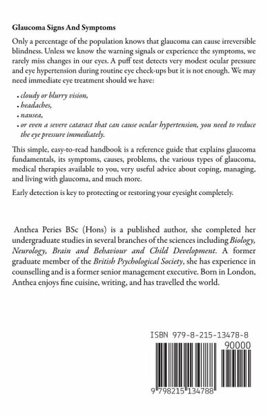 Glaucoma Signs And Symptoms Only a percentage of the population knows that glaucoma can cause irreversible blindness. Unless we know the warning signals or experience the symptoms, we rarely miss changes in our eyes. A puff test detects very modest ocular pressure and eye hypertension during routine eye check-ups but it is not enough. We may need immediate eye treatment should we have:cloudy or blurry vision, headaches, nausea, or even a severe cataract that can cause ocular hypertension, you need to reduce the eye pressure immediately. This simple, easy-to-read handbook is a reference guide that explains glaucoma fundamentals, its symptoms, causes, problems like potential blindness, the various types of glaucoma, medical therapies available to you, very useful advice about coping, managing, and living with glaucoma, and much more. Early detection is key to protecting or restoring your eyesight completely. If you have been diagnosed with glaucoma or know someone that has then this book is for you. Find out more today. GET THIS BOOK NOW.