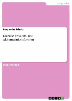 Studienarbeit aus dem Jahr 2009 im Fachbereich Geowissenschaften / Geographie - Phys. Geogr., Geomorphologie, Umweltforschung, Note: 1,0, Rheinisch-Westfälische Technische Hochschule Aachen (Geographisches Institut), Veranstaltung: Grundseminar Physische Geographie, Sprache: Deutsch, Abstract: Der Einfluß von Schnee, Eismassen und Gletschern auf die Landschaftsformen der Erde ist ein wichtiger Forschungsbereich in der Geomorphologie. Im Verlauf der Erdgeschichte war die Erdoberfläche unterschiedlich stark von Eis bedeckt. Der Wandel dervorherrschenden Klimabedingungen auf der Erde bedingt sowohl das Abschmelzen als auch die Ausdehnung der Eismassen. Aufgrund der globalen Erwärmung wird gegenwärtig der weltweite Rückgang der Eisbedeckung beobachtet. In den vergangenen Kaltzeiten herrschte hingegen die weiträumige Ausbreitung der Eismassen vor. Dabeihat das Eis formend auf die Erdoberfläche eingewirkt. Viele markante Landschaften, u.a. in Europa und Nordamerika, sind dadurch entstanden. Die Spuren, welche die Eismassen dort hinterlassen haben, treten auf unterschiedliche Art in Erscheinung. In den glazial geprägten Gebieten sind viele typische Formen bis in die heutige Zeit erhalten geblieben. Diese Gegebenheiten begünstigen sowohl die Erforschung der Gletscher als auch die Untersuchungen über den Einfluß von Gletscherbewegungen auf die Landschaft und das Relief.Diese Arbeit beschäftigt sich mit den glazialen Erosions- und Akkumulationsformen und stellt eine Zusammenschau des glazialen Formenschatzes dar. Dabei wird ausschließlich auf Formen und Prozesse eingegangen die im unmittelbaren Zusammenhang mit dem Gletschereis stehen. Glazifluviale Formen und Prozesse werden nicht behandelt.