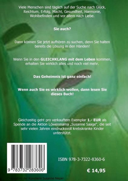 Viele Menschen sind täglich auf der Suche nach Glück, Reichtum, Erfolg, Macht, Gesundheit, Harmonie, Wohlbefinden und vor allem nach Liebe. Sie auch? Dann können Sie jetzt aufhören zu suchen, denn Sie halten bereits die Lösung in den Händen! Wenn Sie in den GLEICHKLANG mit dem Leben kommen, erhalten Sie wirklich alles und noch viel mehr. Das Geheimnis ist ganz einfach! Wenn auch Sie es wirklich wollen, dann lesen Sie dieses Buch! Gleichzeitig geht pro verkauftem Exemplar 1.- EUR als Spende an die Aktion Löwenmama "Susanne Saage", die seit sehr vielen Jahren eindrucksvoll krebskranke Kinder unterstützt.