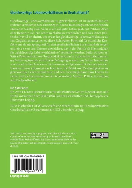 Gleichwertige Lebensverhältnisse zu gewährleisten, ist in Deutschland ein rechtlich verankertes Ziel. Dieses Open-Access-Buch analysiert, welche Aspekte Menschen wichtig sind, wenn es um ein gutes Leben geht, mit welchen Orten oder Regionen sie ihre Lebensverhältnisse vergleichen und was ihnen politisch sinnvoll erscheint, um etwas für gleichwertige Lebensverhältnisse zu tun. Zugleich erkundet es, ob diese Sichtweisen Potenzial für räumliche Konflikte und damit Sprengstoff für den gesellschaftlichen Zusammenhalt bergen und ob sie von den Themen abweichen, die in der Politik als Kennzeichen für "gleichwertige Lebensverhältnisse" betrachtet werden. Dafür wurden 913 Seiten Datenmaterial aus Gruppendiskussionen in 24 deutschen Kommunen, 915 Seiten ergänzende schriftliche Befragungen sowie 203 Seiten Transkripte von einordnenden Interviews mit kommunalen Spitzenverbänden ausgewertet. Darüber hinaus informiert das Buch über die Politik und Zuständigkeiten für gleichwertige Lebensverhältnisse und den Forschungsstand zum Thema. Es richtet sich an Interessierte aus der Wissenschaft, Medien, Politik, Verwaltung und Zivilgesellschaft.