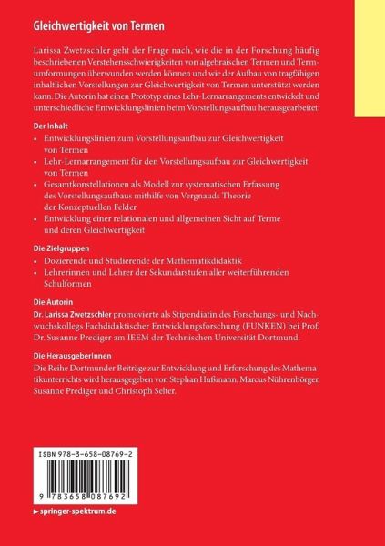 Entwicklungslinien zum Vorstellungsaufbau zur Gleichwertigkeit von Termen.- Lehr-Lernarrangement für den Vorstellungsaufbau zur Gleichwertigkeit von Termen.- Gesamtkonstellationen als Modell zur systematischen Erfassung des Vorstellungsaufbaus mithilfe von Vergnauds Theorie der Konzeptuellen Felder.- Entwicklung einer relationalen und allgemeinen Sicht auf Terme und deren Gleichwertigkeit.