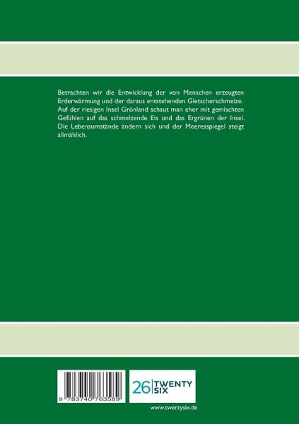 Betrachten wir die Entwicklung der von Menschen erzeugten Erderwärmung und der daraus entstehenden Gletscherschmelze.Auf der riesigen Insel Grönland schaut man eher mit gemischten Gefühlen auf das schmelzende Eis und das Ergrünen der Insel. Die Lebensumstände ändern sich und der Meeresspiegel steigt allmählich.