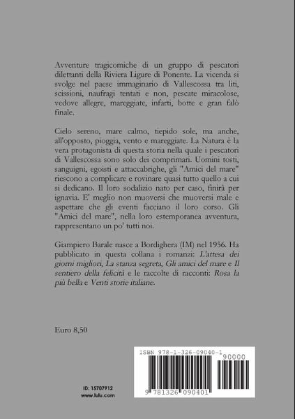 Avventure tragicomiche di un gruppo di pescatori dilettanti della Riviera Ligure di Ponente. La vicenda si svolge nel paese immaginario di Vallescossa tra liti, scissioni, naufragi tentati e non, pescate miracolose, vedove allegre, mareggiate, infarti, botte e gran falò finale. Cielo sereno, mare calmo, tiepido sole, ma anche, all'opposto, pioggia, vento e mareggiate. La Natura è la vera protagonista di questa storia nella quale i pescatori di Vallescossa sono solo dei comprimari. Uomini tosti, sanguigni, egoisti e attaccabrighe, gli "Amici del mare" riescono a complicare e rovinare quasi tutto quello a cui si dedicano. Il loro sodalizio nato per caso, finirà per ignavia. E' meglio non muoversi che muoversi male e aspettare che gli eventi facciano il loro corso. Gli "Amici del mare", nella loro estemporanea avventura rappresentano un po' tutti noi.