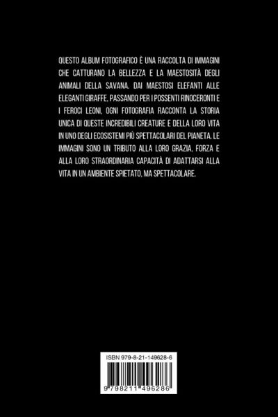 Questo album fotografico è una raccolta di immagini che catturano la bellezza e la maestosità degli animali della savana. Dai maestosi elefanti alle eleganti giraffe, passando per i possenti rinoceronti e i feroci leoni, ogni fotografia racconta la storia unica di queste incredibili creature e della loro vita in uno degli ecosistemi più spettacolari del pianeta. Le immagini sono un tributo alla loro grazia, forza e alla loro straordinaria capacità di adattarsi alla vita in un ambiente spietato, ma spettacolare.