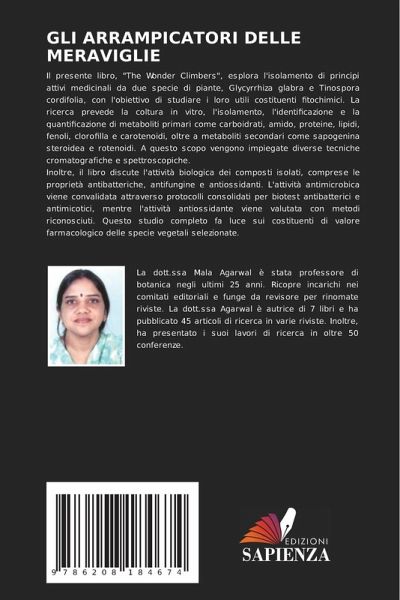 Il presente libro, "The Wonder Climbers", esplora l'isolamento di principi attivi medicinali da due specie di piante, Glycyrrhiza glabra e Tinospora cordifolia, con l'obiettivo di studiare i loro utili costituenti fitochimici. La ricerca prevede la coltura in vitro, l'isolamento, l'identificazione e la quantificazione di metaboliti primari come carboidrati, amido, proteine, lipidi, fenoli, clorofilla e carotenoidi, oltre a metaboliti secondari come sapogenina steroidea e rotenoidi. A questo scopo vengono impiegate diverse tecniche cromatografiche e spettroscopiche.Inoltre, il libro discute l'attività biologica dei composti isolati, comprese le proprietà antibatteriche, antifungine e antiossidanti. L'attività antimicrobica viene convalidata attraverso protocolli consolidati per biotest antibatterici e antimicotici, mentre l'attività antiossidante viene valutata con metodi riconosciuti. Questo studio completo fa luce sui costituenti di valore farmacologico delle specie vegetali selezionate.