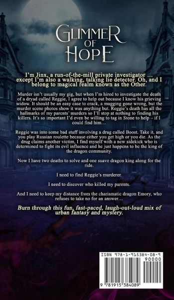 Glimmer of Hope Blurb: I'm Jinx, a run-of-the-mill private investigator ... except I'm also a walking, talking lie detector. Oh, and I belong to magical realm known as the Other. Murder isn't usually my gig, but when I'm hired to investigate the death of a dryad called Reggie, I agree to help out because I know his grieving widow. It should be an easy case to crack, a mugging gone wrong, but the murder scene photos show it was anything but. Reggie's death has all the hallmarks of my parents' murders so I'll stop at nothing to finding his killers. It's so important I'd even be willing to tag in Stone to help - if I could find him... Reggie was into some bad stuff involving a drug called Boost. Take it, and you play Russian roulette because either you get high or you die. As the drug claims another victim, I find myself with a new sidekick who is determined to fight its evil influence and he just happens to be the king of the dragon community. Now I have two deaths to solve and one suave dragon king along for the ride. I need to find Reggie's murderer. I need to discover who killed my parents. And I need to keep my distance from the charismatic dragon Emory, who refuses to take no for an answer... Excerpt: I was heading back to my car when my phone rang, it was an unknown number. I swiped to answer. 'Sharp Security Services,' I said in my best phone voice. 'Jinx?' the voice on the line asked. 'Speaking.' 'It's Emory.' I stilled. It wasn't a common name. A picture shot into my mind of a mighty red dragon roaring as he clashed with the shield of Mrs H's magic. The flashback was so strong it took me a beat to respond. 'Emory? The dragon?' There was a pause. 'Yes.' 'You can use a phone with your claws?' I asked curiously. A longer pause, during which I suspected he was regretting calling me. 'I'm in my human form,' he said finally. 'Sure,' I said breezily, like that had occurred to me. Dragons had a human form? 'So, how can I help?' Description: Fans of Annette Marie, Helen Harper and Kim Richardson will love this series. This is a fun urban fantasy mystery novel featuring a women sleuth, with vampires, hell hounds and dragon shifters.