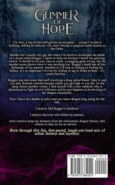 Glimmer of Hope Blurb: I'm Jinx, a run-of-the-mill private investigator ... except I'm also a walking, talking lie detector. Oh, and I belong to magical realm known as the Other. Murder isn't usually my gig, but when I'm hired to investigate the death of a dryad called Reggie, I agree to help out because I know his grieving widow. It should be an easy case to crack, a mugging gone wrong, but the murder scene photos show it was anything but. Reggie's death has all the hallmarks of my parents' murders so I'll stop at nothing to finding his killers. It's so important I'd even be willing to tag in Stone to help - if I could find him... Reggie was into some bad stuff involving a drug called Boost. Take it, and you play Russian roulette because either you get high or you die. As the drug claims another victim, I find myself with a new sidekick who is determined to fight its evil influence and he just happens to be the king of the dragon community. Now I have two deaths to solve and one suave dragon king along for the ride. I need to find Reggie's murderer. I need to discover who killed my parents. And I need to keep my distance from the charismatic dragon Emory, who refuses to take no for an answer... Excerpt: I was heading back to my car when my phone rang, it was an unknown number. I swiped to answer. 'Sharp Security Services,' I said in my best phone voice. 'Jinx?' the voice on the line asked. 'Speaking.' 'It's Emory.' I stilled. It wasn't a common name. A picture shot into my mind of a mighty red dragon roaring as he clashed with the shield of Mrs H's magic. The flashback was so strong it took me a beat to respond. 'Emory? The dragon?' There was a pause. 'Yes.' 'You can use a phone with your claws?' I asked curiously. A longer pause, during which I suspected he was regretting calling me. 'I'm in my human form,' he said finally. 'Sure,' I said breezily, like that had occurred to me. Dragons had a human form? 'So, how can I help?' Description: Fans of Annette Marie, Helen Harper and Kim Richardson will love this series. This is a fun urban fantasy mystery novel featuring a women sleuth, with vampires, hell hounds and dragon shifters.
