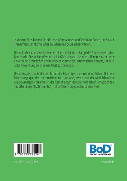 In diesem Buch können alle jene Informationen und Techniken gefunden werden, die auf dem Weg zum Nichtraucher unbedingt notwendig werden. Dieses Buch verdankt sein Entstehen einem vieljährigen Kampf des Autors gegen seine Rauchsucht. Dieser Kampf wurde schließlich siegreich beendet, allerdings nicht unter Anwendung der üblichen und meist sehr kommerziell ausgenutzten Rezepte, sondern unter Anwendung einer neuen Ausstiegsmethodik. Diese Ausstiegsmethodik beruht auf der Erkenntnis, dass mit dem Willen allein ein Rauchstopp gar nicht zu erreichen ist, dass aber, wenn erst der Modulcharakter des Bewusstseins erkannt ist, der Kampf gegen den die Willenskraft schädigenden Hauptfeind, das Nikotin nämlich, mit positivem Ergebnis zu bestehen sein wird.