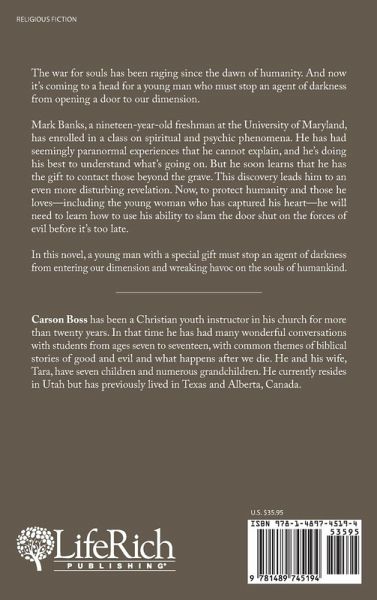 The war for souls has been raging since the dawn of humanity. And now it's coming to a head for a young man who must stop an agent of darkness from opening a door to our dimension. Mark Banks, a nineteen-year-old freshman at the University of Maryland, has enrolled in a class on spiritual and psychic phenomena. He has had seemingly paranormal experiences that he cannot explain, and he's doing his best to understand what's going on. But he soon learns that he has the gift to contact those beyond the grave. This discovery leads him to an even more disturbing revelation. Now, to protect humanity and those he loves-including the young woman who has captured his heart-he will need to learn how to use his ability to slam the door shut on the forces of evil before it's too late. In this novel, a young man with a special gift must stop an agent of darkness from entering our dimension and wreaking havoc on the souls of humankind.