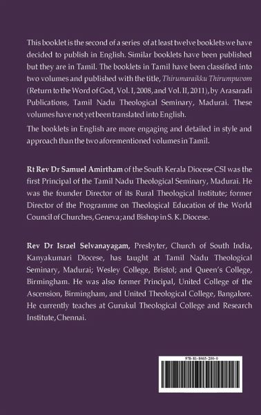 This booklet is the second of a series of a t lea st hvelve booklets we have decided to publish in English. Similar booklets have been published but they are in Tamil. The booklets in Tamil have been classified into two volumes and published with the title, Thirunzaraikku Thirumpuvom (Return to the Word of God, Vol. I, 2008, and Vol. II, 2011), by A rasaradi Publications, Tamil Nadu Theological Seminary, Madurai. These volumes have not ye t been translated into English. The booklets in English are more engaging and detailed in style and approach than the two aforementioned volumes in Tamil.