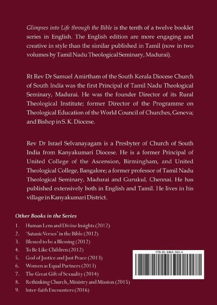 Glimpses into Life through the Bible is the tenth of a twelve booklet series in English. The English edition are more engaging and creative in style than the similar published in Tamil (now in two volumes by Tamil Nadu Theological Seminary, Madurai).