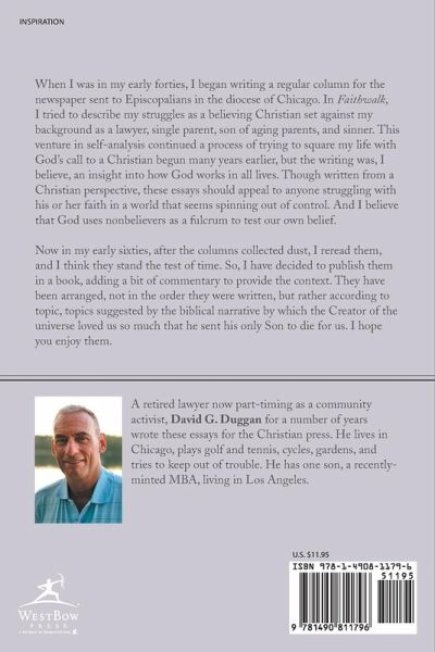 When I was in my early forties, I began writing a regular column for the newspaper sent to Episcopalians in the diocese of Chicago. In Faithwalk, I tried to describe my struggles as a believing Christian set against my background as a lawyer, single parent, son of aging parents, and sinner. This venture in self-analysis continued a process of trying to square my life with God's call to a Christian begun many years earlier, but the writing was, I believe, an insight into how God works in all lives. Though written from a Christian perspective, these essays should appeal to anyone struggling with his or her faith in a world that seems spinning out of control. And I believe that God uses nonbelievers as a fulcrum to test our own belief. Now in my early sixties, after the columns collected dust, I reread them, and I think they stand the test of time. So, I have decided to publish them in a book, adding a bit of commentary to provide the context. They have been arranged, not in the order they were written, but rather according to topic, topics suggested by the biblical narrative by which the Creator of the universe loved us so much that he sent his only Son to die for us. I hope you enjoy them.