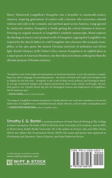 Henry Wadsworth Longfellow's Evangeline was a bestseller in nineteenth-century America, inspiring generations of readers with a heroine who overcomes colonial violence and exile in her romantic and spiritual quest across America. Long ignored by modernist scholars, Evangeline is finally getting the critical attention it deserves. Drawing on original research in Longfellow's scholarly manuscripts, Bartel explores the theological sources and spiritual world of Evangeline, arguing that Longfellow was inspired by the church fathers to craft Evangeline into a heroine who uniquely exemplifies, in her epic quest, the ancient Christian doctrines of deification and divine light. Bartel's Glimpses of Her Father's Glory returns Evangeline to its rightful place as a major poem of American literature, one that takes as its theme nothing less than the ultimate purpose of human existence.