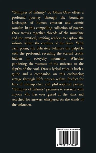 "Glimpses of Infinity" by Olivia Orav offers a profound journey through the boundless landscapes of human emotion and cosmic wonder. In this compelling collection of poetry, Orav weaves together threads of the mundane and the mystical, inviting readers to explore the infinite within the confines of the finite. With each poem, she delicately balances the palpable with the profound, revealing the eternal truths hidden in everyday moments. Whether pondering the vastness of the universe or the depths of the soul, Orav's lyrical voice is both a guide and a companion on this enchanting voyage through life's unseen realms. Perfect for fans of introspective and philosophical poetry, "Glimpses of Infinity" promises to resonate with anyone who has ever gazed at the stars and searched for answers whispered on the winds of the unknown. Copyright (c) 2024 Swan Charm Publishing