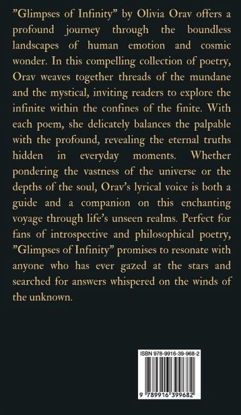 "Glimpses of Infinity" by Olivia Orav offers a profound journey through the boundless landscapes of human emotion and cosmic wonder. In this compelling collection of poetry, Orav weaves together threads of the mundane and the mystical, inviting readers to explore the infinite within the confines of the finite. With each poem, she delicately balances the palpable with the profound, revealing the eternal truths hidden in everyday moments. Whether pondering the vastness of the universe or the depths of the soul, Orav's lyrical voice is both a guide and a companion on this enchanting voyage through life's unseen realms. Perfect for fans of introspective and philosophical poetry, "Glimpses of Infinity" promises to resonate with anyone who has ever gazed at the stars and searched for answers whispered on the winds of the unknown. Copyright © 2024 Swan Charm Publishing